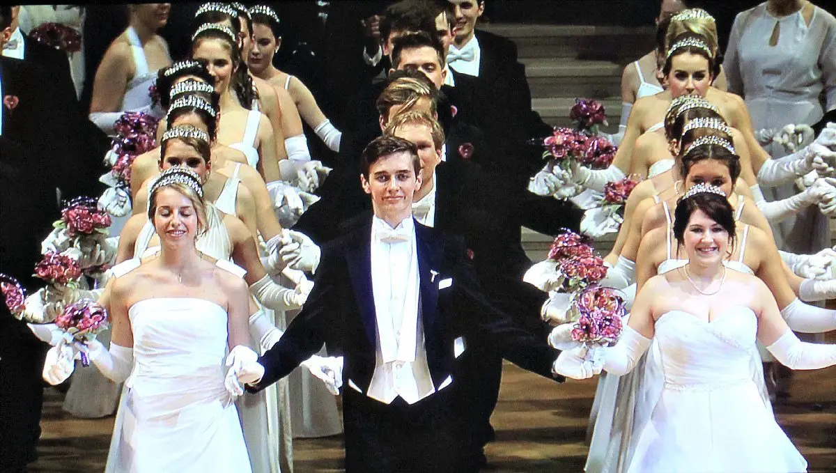 Seven dozen young ball debutants in white dresses and black tuxedos, with rosy cheeks and thumping hearts paraded through the glittering main ballroom, bowed, curtsied and finally broke off into waltz swirls.
